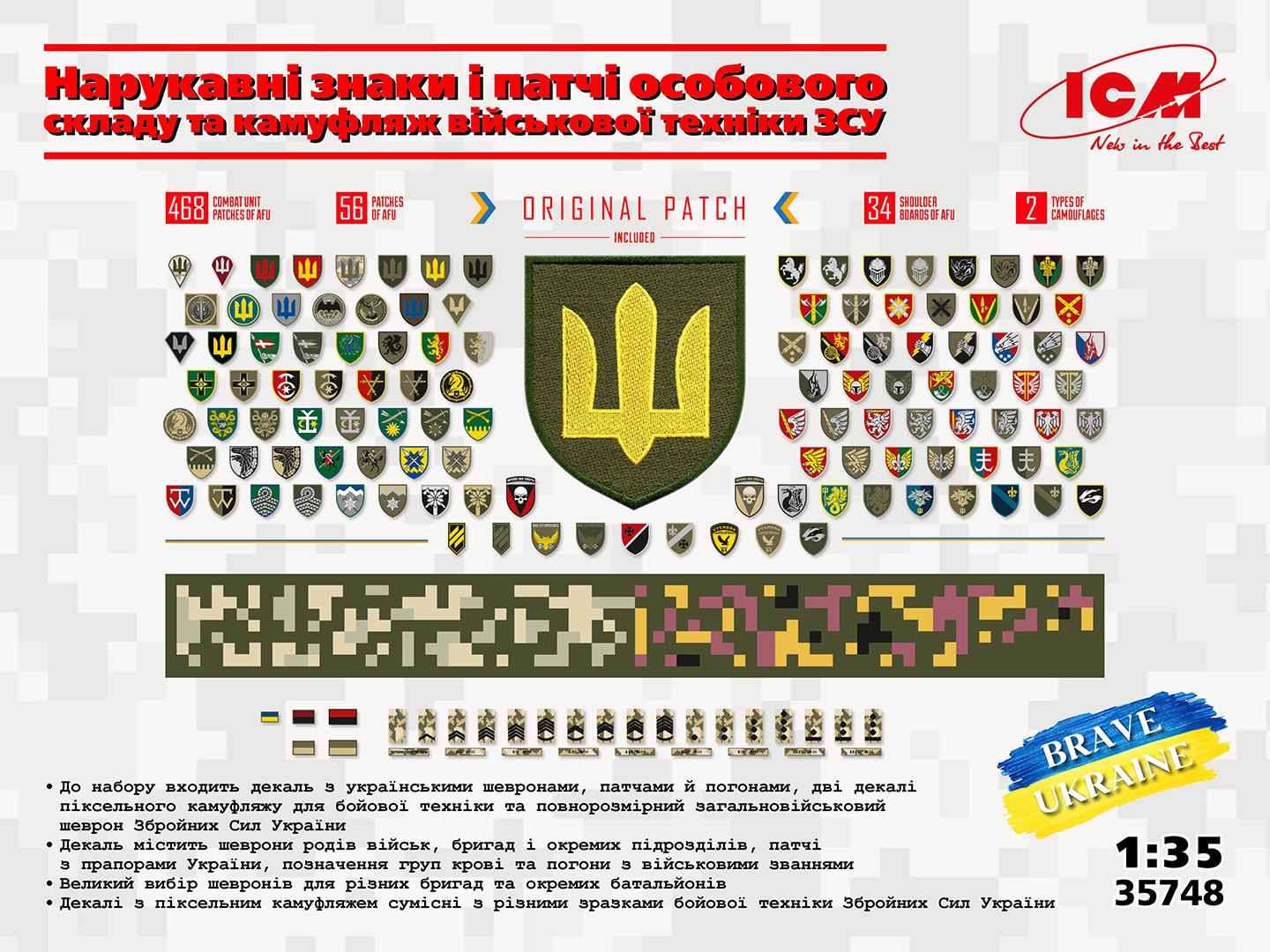 Набір декалей ICM дозволяє відтворити сучасні нарукавні знаки, патчі військовослужбовців ЗСУ та камуфляж української військової техніки. Ці елементи не лише допомагають точно передати вигляд українських військових, а й підкреслюють унікальність армійської символіки.