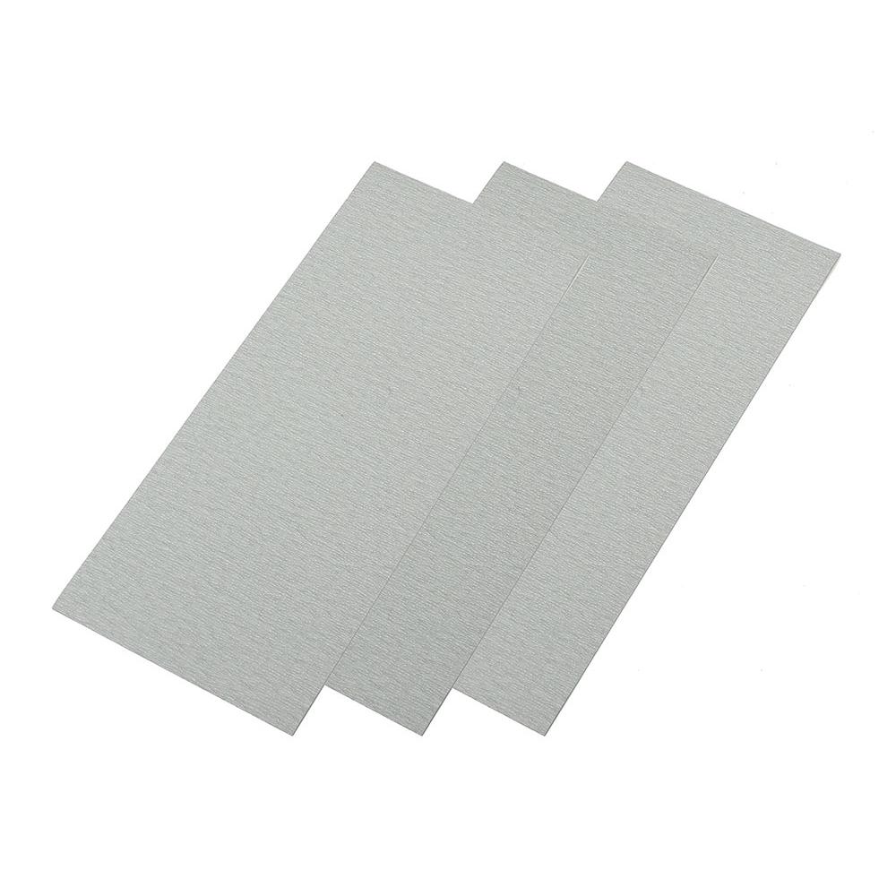 У наборі міститься 3 аркуші наждачного паперу, які можна використовувати як у сухому, так і у вологому режимі. Це робить комплект універсальним для роботи з пластиком, смолою та м’якими металами.