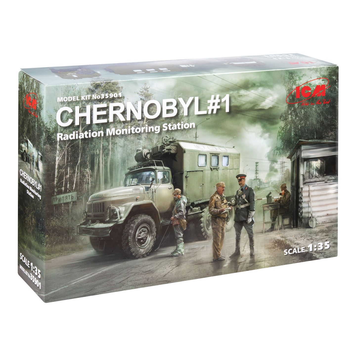 Збірна модель ICM – Чорнобиль#1. Пункт радіаційного контролю (ЗіЛ-131КШМ, 5 фігур та підставка для діорами з фоном) (35901) – це високоякісна пластикова модель, яка дозволяє відтворити історичний момент з Чорнобильської катастрофи. Ця масштабна модель у масштабі 1:35 стане чудовим доповненням до вашої колекції або ідеальним подарунком для любителів моделювання.
